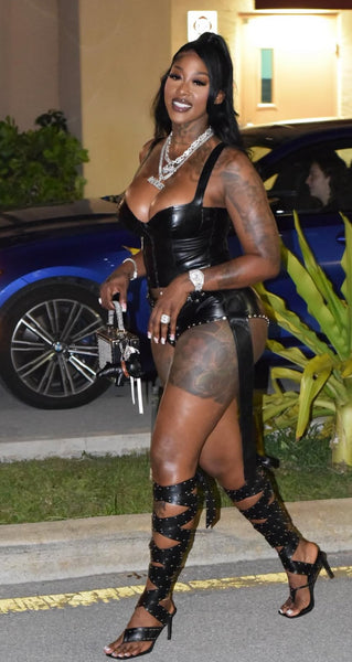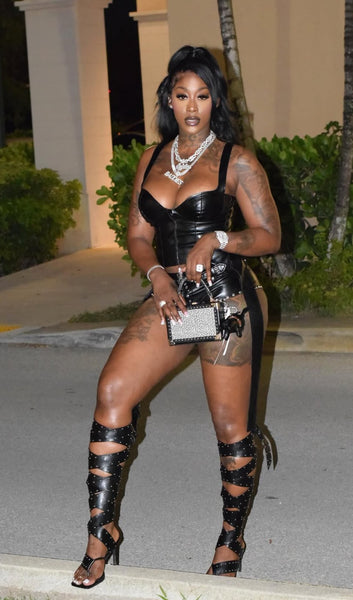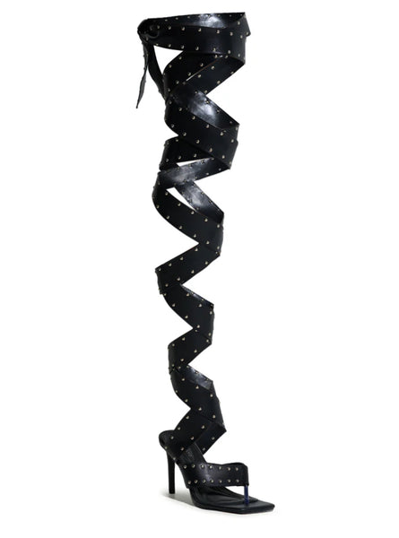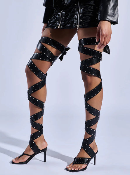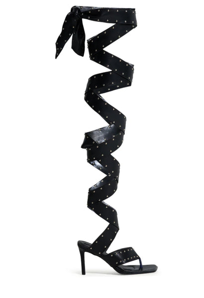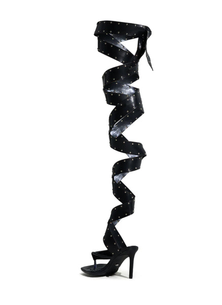 She’s a femme fatale in The CITY GIRL Black Studded Strapped Sandal. These sexy sandals feature an open square toe silhouette, a slim stiletto heel, a cushioned faux leather insole, a wide thong toe strap, and coordinating, thigh-high straps that wrap up and around the leg. Complete with petite silver stud embellishments throughout.