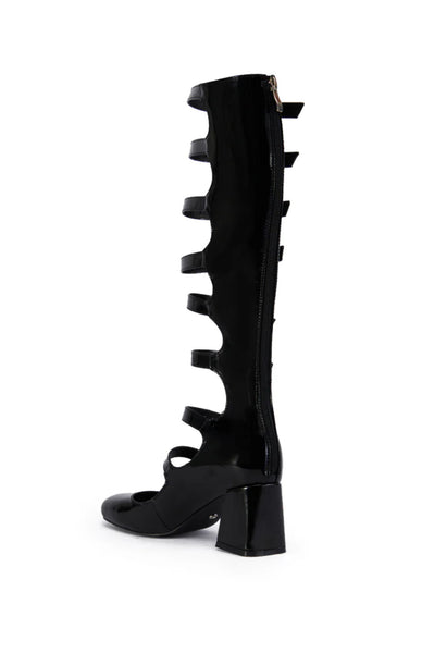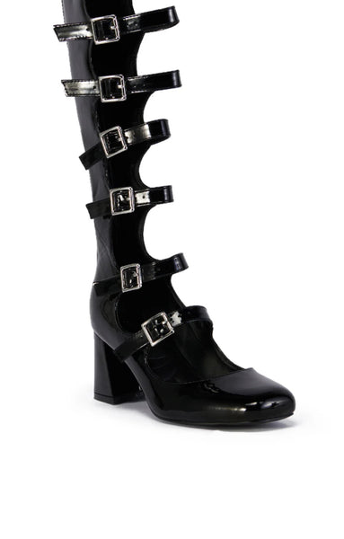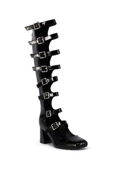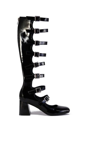 French girl chic. The KEYAZIA LAMB feta Black Patent Buckle Up Boot is a super sweet yet sexy faux leather style featuring a square toe silhouette, a knee-high shaft, a chunky low heel, tonal stitching, a Comfort Cushion insole, and a tonal back ankle zipper closure. Complete with silver metallic hardware, cut out detailing down the front, and a row of adjustable buckled belt straps to help customize your most comfortable, ideal fit.